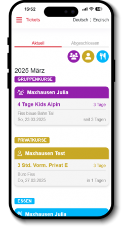 Sämtliche gebuchte Tickets des Gastes sind in der App schnell abrufbar. Somit kann der Gast jederzeit alle Infos rund um seine Buchungen nachlesen, wie z.B. an welchem Sammelplatz er sich einzufinden hat oder um welche Uhrzeit es los geht.
